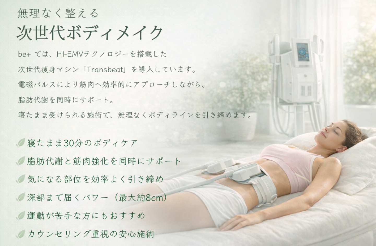 be+のボディケアは、HI-EMVテクノロジーを採用した「Transbeat(トランスビート)」による施術です。筋肉へ的確に働きかけながら脂肪代謝も同時に後押しし、効率よくボディラインを整えます。寝たまま30分の施術で、気になる部位を無理なく引き締めボディラインへ導きます。従来のEMS等、筋肉表層へのアプローチ中心のマシンとは異なり深部まで届くパワー(最大約8cm)で、より効率的・効果的なボディケアが可能です。