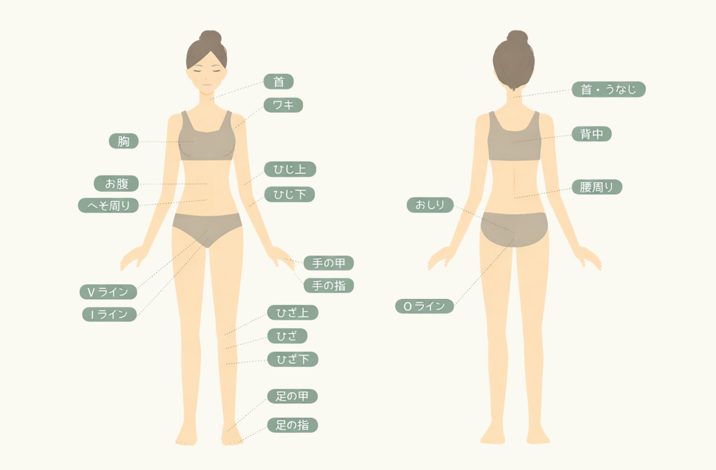 表示している部位は一例です。お肌の状態や毛質を丁寧に確認したうえで、施術内容はお一人おひとりに合わせてご案内いたします。